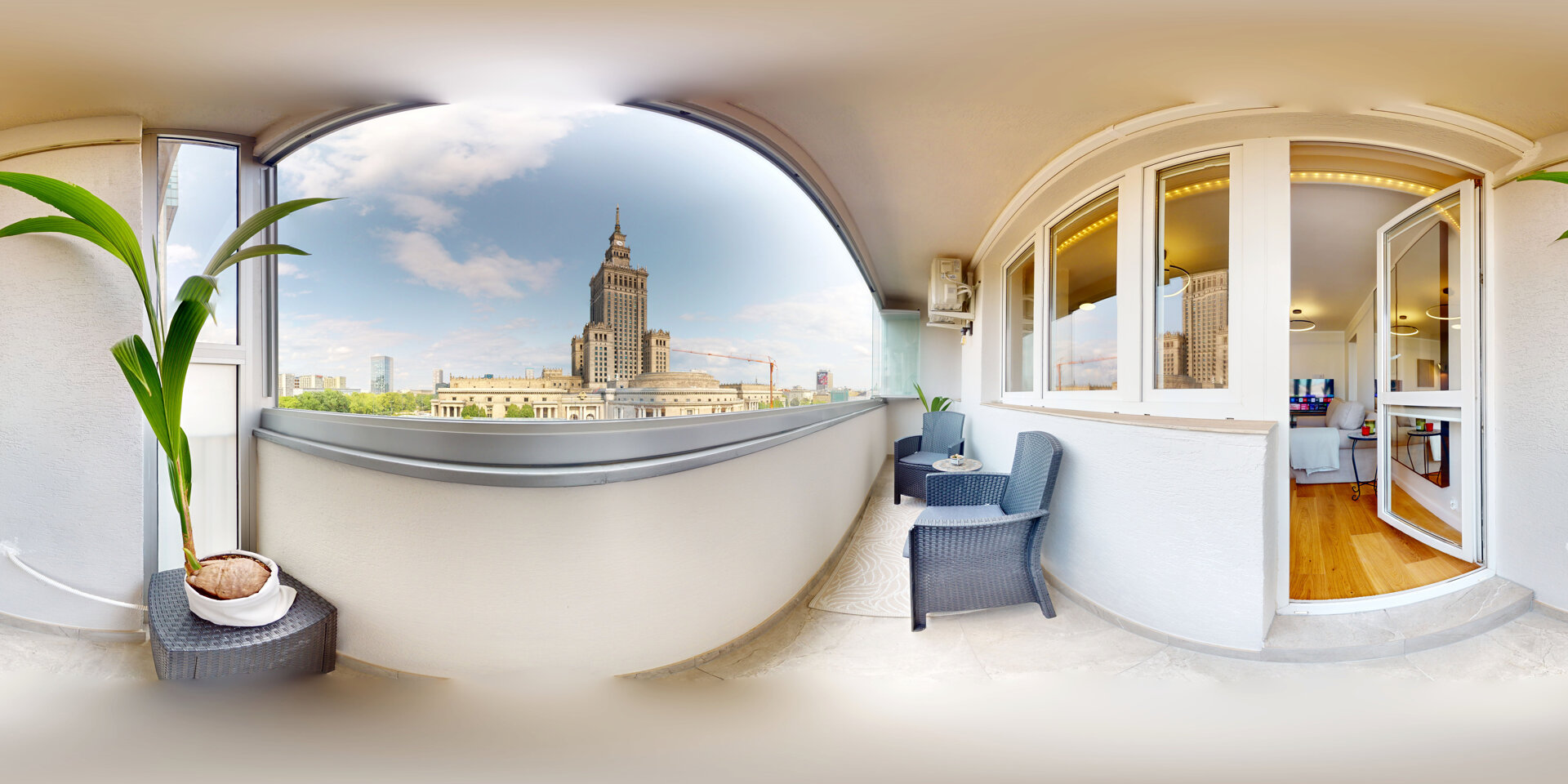Z przestronnego tarasu i sypialni roztacza się zapierający dech w piersiach widok na najwyższy budynek w Unii Europejskiej - Varso Tower 310 m wysokości. W Apartamencie dostępne są 3 sypialnie, salon i taras. Widok: Przestronny taras na 8 piętrze z pan